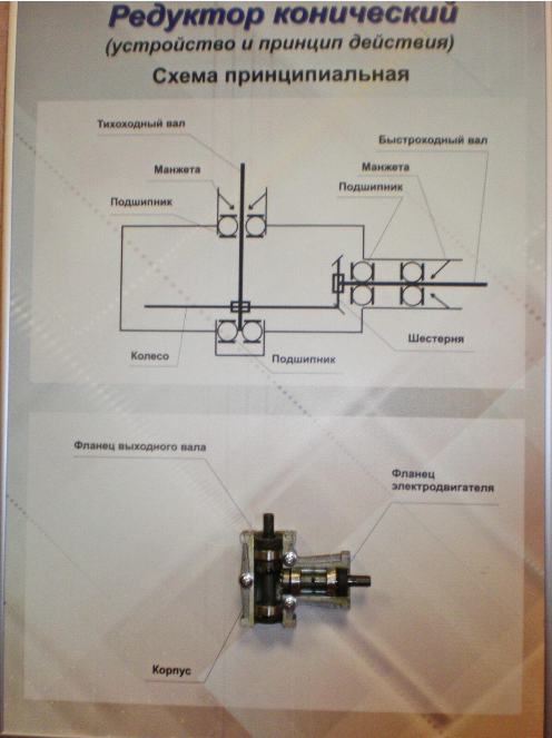 Планшет позволяет изучать устройство конического редуктора, делать измерения геометрических параметров зацепления определять передаточное отношение методами вращения вала и через числа зубьев колес.