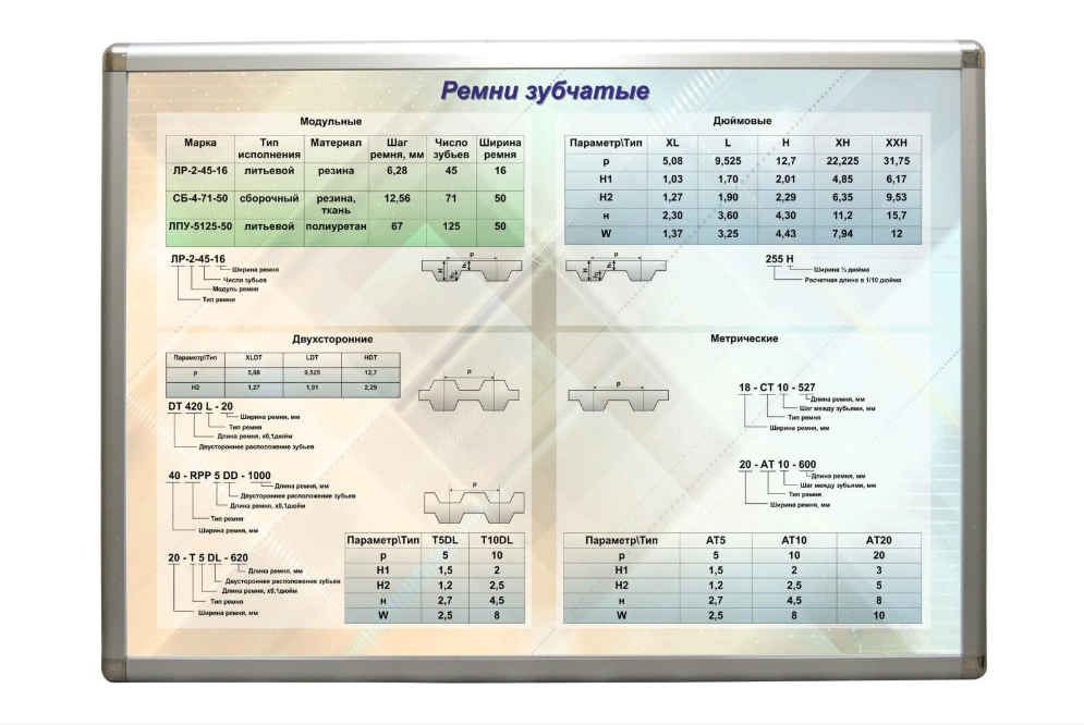 Плакат формата А1 с возможностью использования в настенном и настольном вариантах. На плакате размещена классификация, обозначения и образцы зубчатых ремней в натуральную величину, а именно: