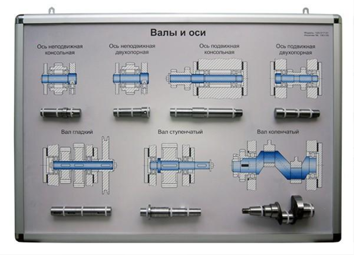 Планшет формата А1 с возможностью использования в настенном и настольном вариантах с закрепленными на нем образцами валов и осей.