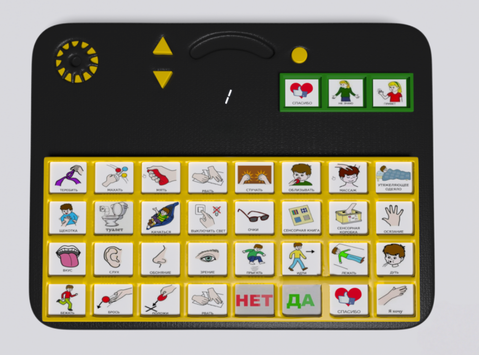 Гоу! игровой коммуникатор 32+ разработан для индивидуального использования одним ребенком и групповых занятий с детьми, имеющих проблемы со слуховым, зрительным, тактильным восприятием и коммуникацией. Прямоугольный корпус оснащён 32-мя кнопками (с кармашками для вкладышей),предназначенных для записи и воспроизведения голосовых сообщений. Устройство изготовлено из высококачественного ударопрочного пластика, имеет обтекаемые плавные формы без острых краёв и углов.