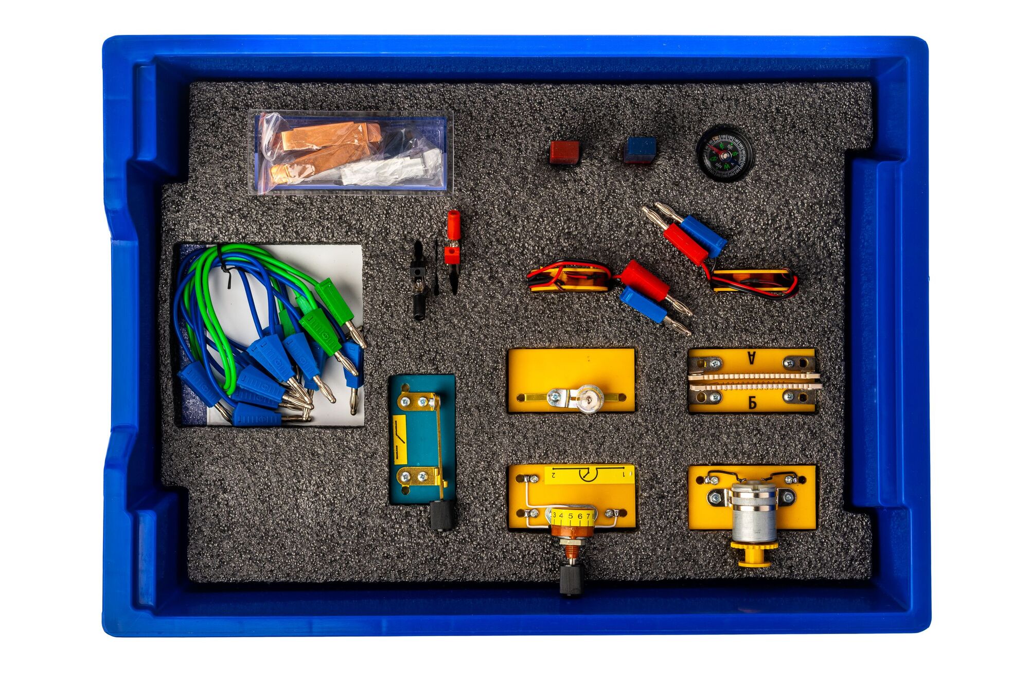 Состав набора оптимизирован таким образом, чтобы при проведении экспериментов можно было задействовать общее оборудование кабинета физики, такое как штатив с крепежными элементами, источник питания постоянного тока, вольтметр и амперметр, без дублирований.