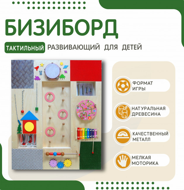 Бизиборд с цепочками и колечками - это яркий и практичный игровой элемент, изготовленный из высококачественной древесины. Он представляет собой уникальный набор разнообразных элементов, включающий тактильные области, ксилофон, кольцеброс, колокольчики на веревочках, фигурки на цепочках, бубен, металлические трубочки, счеты, систему шестеренок и тактильный лабиринт. Преимущества игрушки: