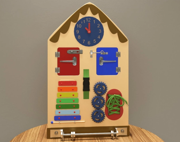 Бизипанель – это удачное сочетание настенной игровой панели и бизиборда. Она больше, обычный компактный бизиборд и более функциональна, чем стандартная настенная игровая панель, так как оснащена большим количеством игровых приспособлений. Основание представленной модели выполнено в спокойном нейтральном бежевом цвете, а игровые элементы выделяются яркими акцентами.