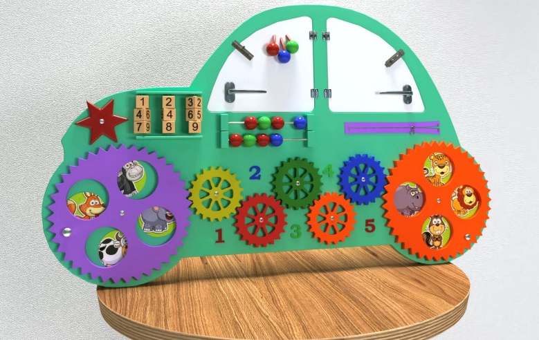 Настенная панель в виде машинки – яркий, красочный игровой элемент с дидактической ценностью. Многофункциональна, несмотря на скромные размеры. Представляет из себя фигурную деревянную доску в форме кареты, оснащённую разнообразными яркими элементами для приобретения детьми дошкольного возраста полезных навыков в формате игры.
