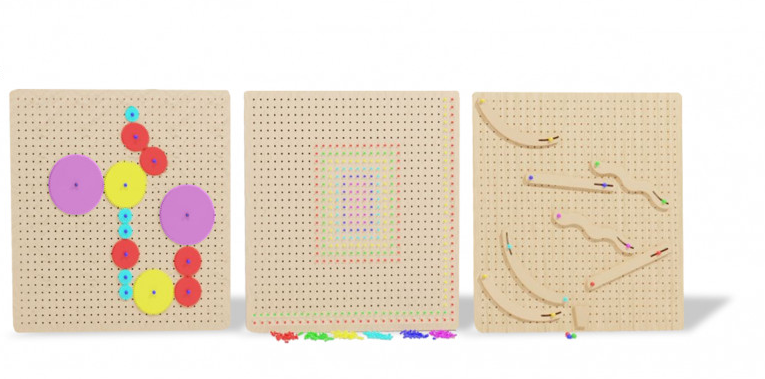 • Три разные доски имеют свое предназначение. В 1-ой можно двигать спирали, вкручивать и выкручивать винты, и переставлять фигуры. На 2-й доске можно с помощью цветных булавок создавать свои рисунки: геометрические фигуры, цифры или просто линии. Вместе изучать цвета, проговаривая их вслух. Во время занятия активно развивается интеллект каждого ребенка. Обучаясь счету, он учится концентрироваться на задаче, воспитывает в себе усидчивость, расширяет словарный запас и анализирует входящую информацию, делая на основе анализа соответствующие выводы. На 3-й доске подвижные фигуры перемещают шарик.