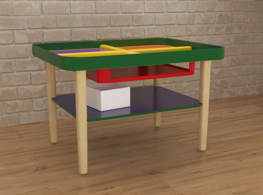 Игровой стол для занятий для сенсорных и тактильных игр имеет простой дизайн – основание темных цветов; игровые же пространства-углубления имеют каждое свой цвет (фиолетовый, розовый, оранжевый, синий). Благодаря высокому полезному потенциалу детский игровой стол можно считать необходимым элементом оснащения пространства для занятий с детьми – его внешний вид и разнообразное применение поможет превратить обычное занятие в весёлую игру.