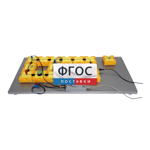 Установка, включающая цепь разряда конденсатора через резистор и цепь его зарядки, собрана на металлической платформе с магнитным закреплением элементов и использованием жестких соединителей для объединения элементов в электрическую цепь. Обозначения элементов нанесены на их лицевой (верхней) поверхности. Кнопочный выключатель обеспечивает отключение конденсатора от источника питания на время разряда через резистор.