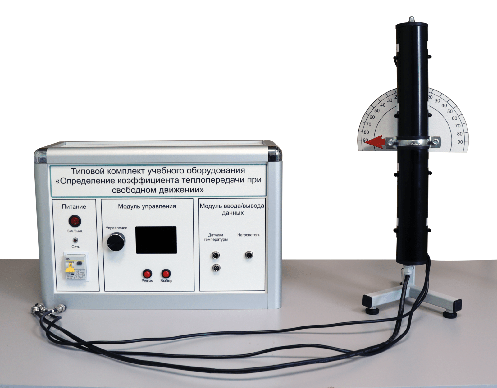 Модуль представляет собой цилиндр, выполненный из медной трубы. Для нагрева поверхности, в модуле установлен нагревательный элемент с регулируемой мощностью. Цилиндр располагается на подставке и имеет поворотный элемент, позволяющий проводить эксперименты в положении цилиндра от 0-90° (диапазонное значение). Для точного определения угла наклона имеется угловая шкала. Модуль подсоединяется к блоку управления при помощи специального разъема.