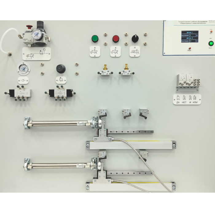 Учебный комплект рассчитан на обучение основам управления пневмоприводами. Элементы пневмоавтоматики жестко закреплены на центральной панели комплекса с целью сокращения времени на монтаж, сохранности элементов и защиты от вандализма. Демонтаж элементов осуществляется только при разборке стенда.